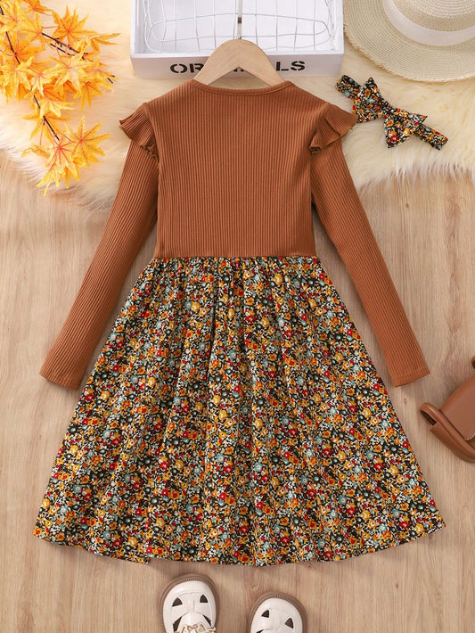 Vestido de manga larga con estampado floral elegante empalmado para niñas para regalo de primavera y otoño