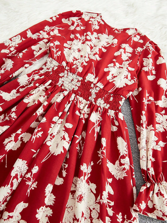 Vestido de manga larga transpirable con estampado floral y cintura fruncida para niña preadolescente