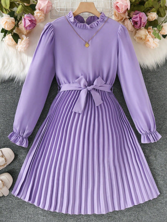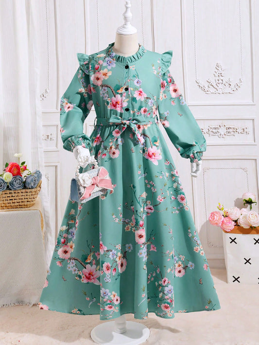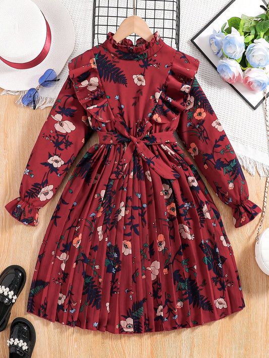 Vestido Plisado Con Estampado Floral, Mangas Largas Y Borde De Volantes Para Niñas Preadolescentes Con Patrón De Flores