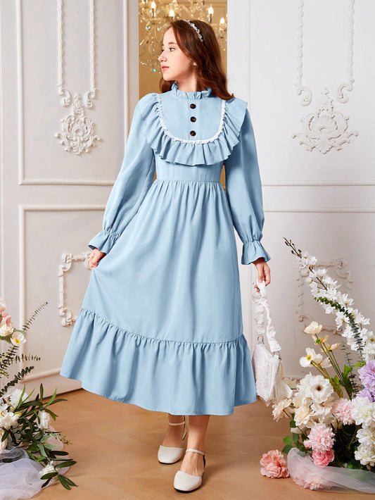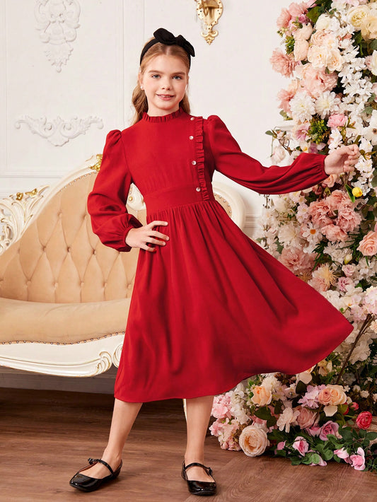 Pieza De Vestido De Cuello Alto Simulado Para Niña Preadolescente Con Manga De Linterna Y Detalles De Botones