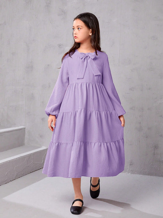 SHEIN Vestido Largo Informal Tejido Para Niña Adolescente De Color Sólido Con Borde De Volante, Dobladillo De Encaje Y Parche De Tela