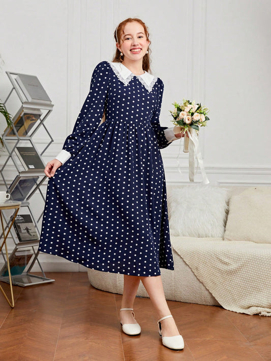 Vestido Casual De Manga Larga Para Niñas Adolescentes Con Cuello De Muñeca De Encaje De Remiendo Tejido Y Dobladillo De Encaje De Lunares.