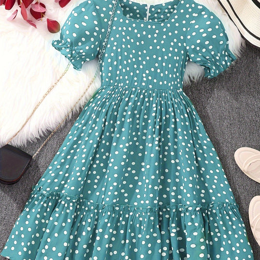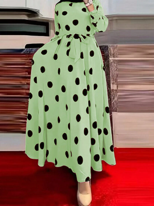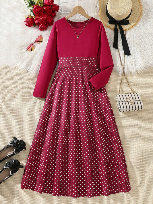 Vestido largo y elegante con lunares para niña preadolescente con cuello redondo y mangas largas, ideal para primavera/otoño
