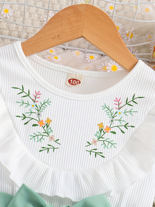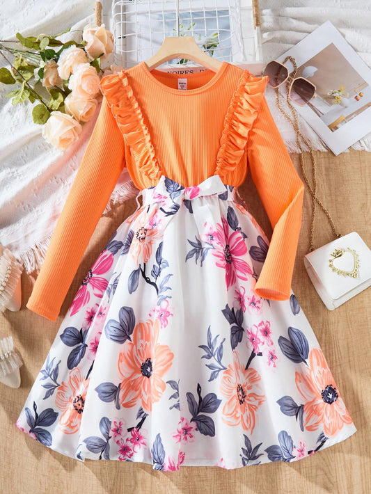 Vestido de manga larga con estampado floral para niñas, con cuello de volantes y cinturón de lazo, cuello redondo casual, moda para el uso diario en primavera y otoño para niños