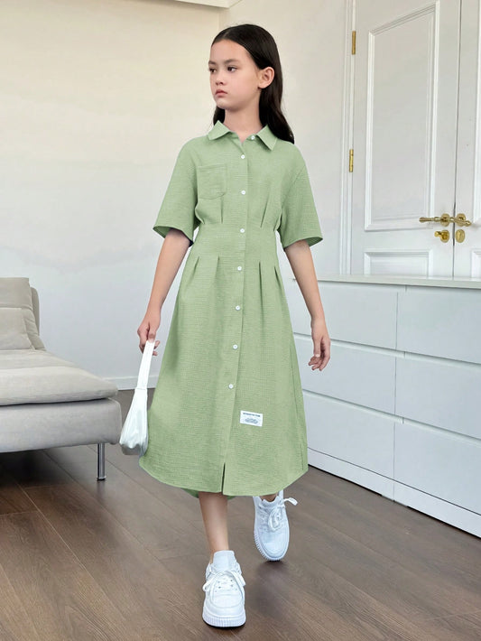 Vestido De Camisa Casual De Manga Corta Con Parches De Alfabeto Tejido Y Cintura Fruncida Para Chicas Preadolescentes