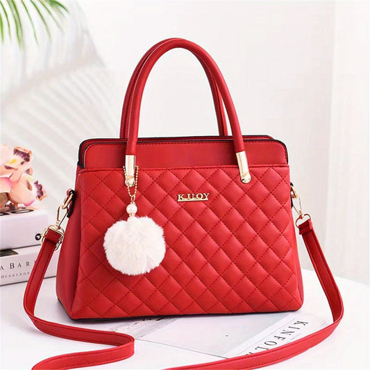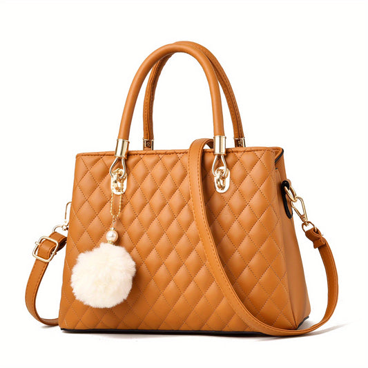 Bolso Tote Clásico Con Patrón De Rombos, Bolso De Hombro Acolchado De Color Sólido, Bolso Con Colgante De Pompón Para Mujer