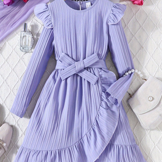 Vestido para niña preadolescente de unicolor con cinturón ajustado a la cintura, mangas cortas y cuello redondo