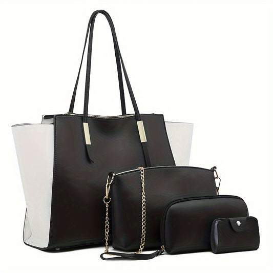 Conjunto de 4 Piezas para Mujer - Bolso Tote a Bloques de Color con Bandolera Glamurosa de Cadena, Cartera de Mano Elegante & Tarjetero