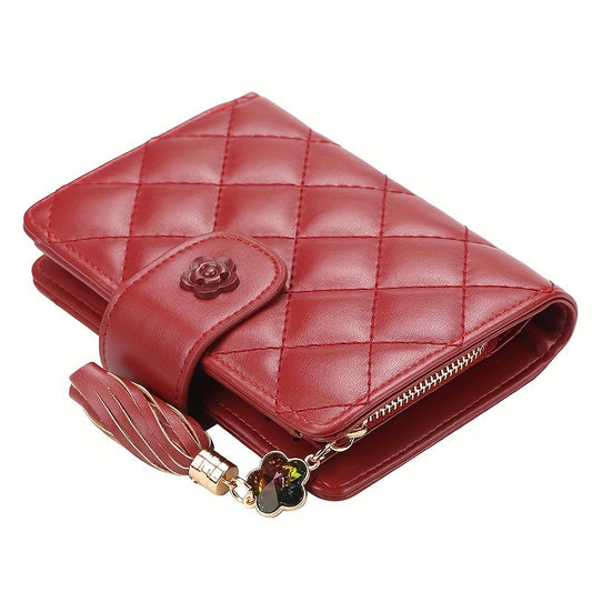 Cartera corta elegante para mujer, monedero casual de tres pliegues de piel sintética, monedero simple con decoración de amor de metal.
