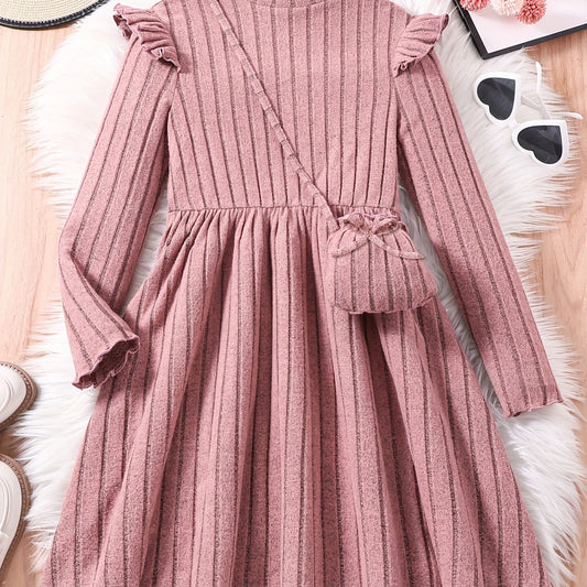2 piezas para niñas, vestido y bolso de manga larga de punto acanalado, ropa para regalo de fiesta de otoño