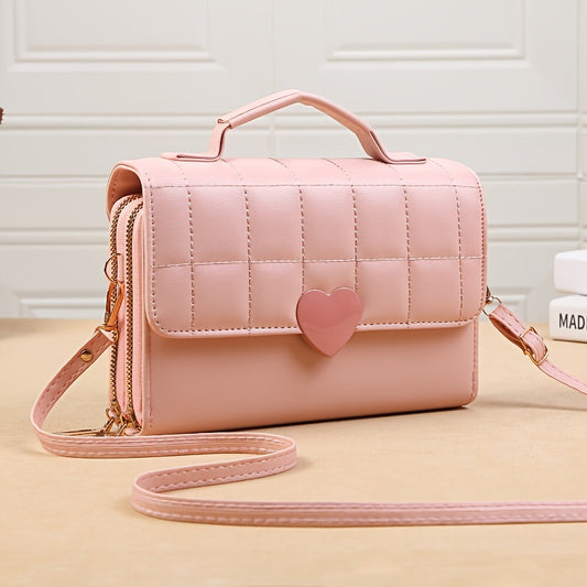 1pc Bolso de hombro bordado a cuadros Sweet Love, elegante bolso de mano para mujer, doble cremallera, compartimentos múltiples, ranura para tarjetas, se puede llevar en un hombro o cruzado