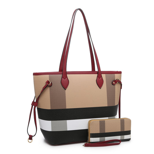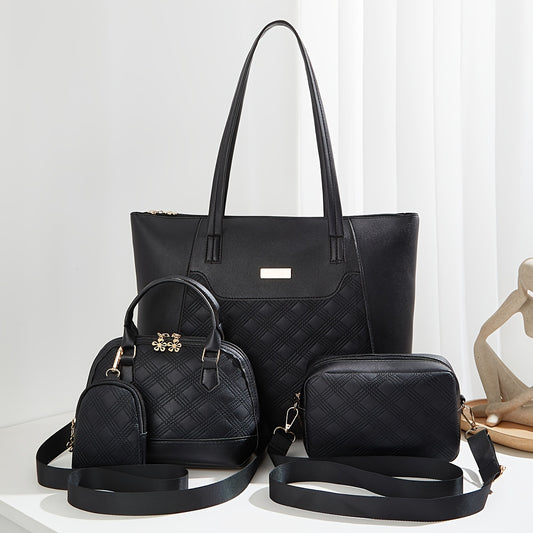 Set de 4 pzas de Bolsas Elegantes con Diseño Argyle para Mujer - Tote Estiloso, Bolso de Mano Tipo Cúpula, Bandolera y Monedero - Colección de Lujo Versátil
