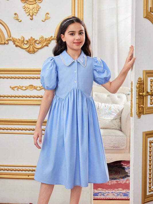 Vestido Estilo Camiseta Con Mangas De Burbuja Y Perlas Para Niña, Estilo Suelto Y Lindo Para Campus