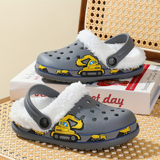 Zuecos de EVA forrados en polar con diseño de vehículo de construcción animado, cómodos y fáciles de poner, tallas 22-35 (para jóvenes), calzado de invierno para clima frío, forro de tela suave, unisex